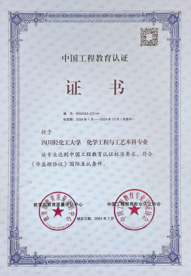 2014年,四川轻化工大学化学工程与工艺专业首次通过了工程教育专业认证。2017年,化学工程与工艺专业第二次通过工程教育专业认证,有效期6年。2022年,化学工程与工艺专业第三次向秘书处提交认证申请并获得受理,专业自评报告于2023年顺利通过化工制药类专业认证委员会的严格审核,工程教育认证专家组于同年10月进校实地考察,对化学工程与工艺专业的教学资源、师资力量、学生素质及支持条件等给予肯定。