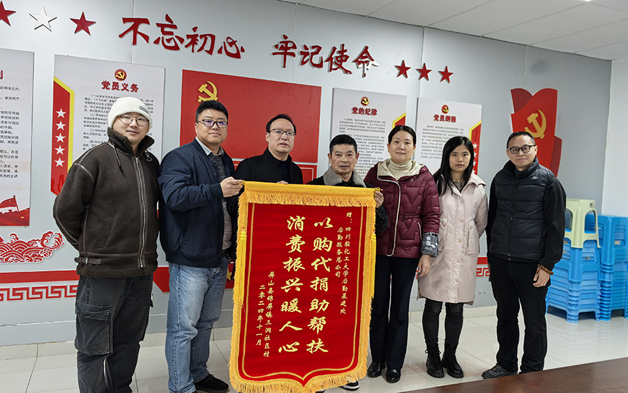11月26日下午,屏山县锦屏镇三洞社区村支书、主任郭开举,村副主任杨再秀,驻村第一书记宁欣强一行五人赴我校,对学校在三洞社区村的乡村振兴帮扶工作表达真诚谢意,并赠送锦旗。后勤基建处处长、后勤服务总公司总经理刘自山接受锦旗。
