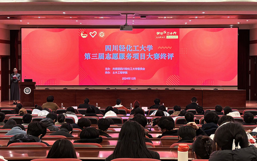 为深入贯彻落实习近平新时代中国特色社会主义思想和习近平总书记关于志愿服务的重要指示精神,不断推动我校志愿服务项目化运作、社会化动员和制度化发展,12月18日,四川轻化工大学第三届志愿服务项目大赛终评在汇东校区学术报告厅举行。本次大赛由校团委主办、土木工程学院承办,邀请了学校教务处副处长潘明,中共自贡市委社会工作部志愿服务和人才科科长谢永刚,共青团自贡市委员会青年发展与社会联络部副部长张晨,自贡市灵志社会工作服务中心主任林伍强和学校团委志愿实践部副主任钟旭珂担任评委。