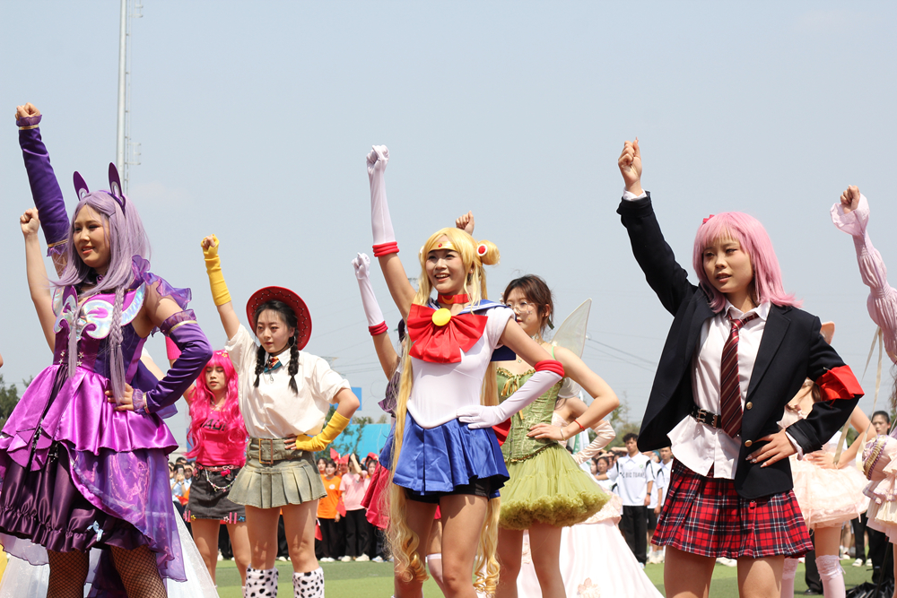 学生方阵的创意展演将现场气氛推向高潮:古典扇子舞将传统美学与现代韵律完美交融;藏族舞者充满力量,飞天舞者衣袂翩跹,用肢体语言讲述着中华民族多元一体的精神之歌;当街舞团队、健身操团队以充满张力的动作点燃全场,cosplay爱好者身着漫画服装惊艳亮相,传统文化与青春创意碰撞出璀璨火花;哪吒吉祥物、震撼的大鼓、迎风招展的红旗,象征着当代青年勇担时代使命的炽热情怀。这既是青春智慧的集中绽放,更是新时代大学生充满时代感与奋进精神的青春交响。