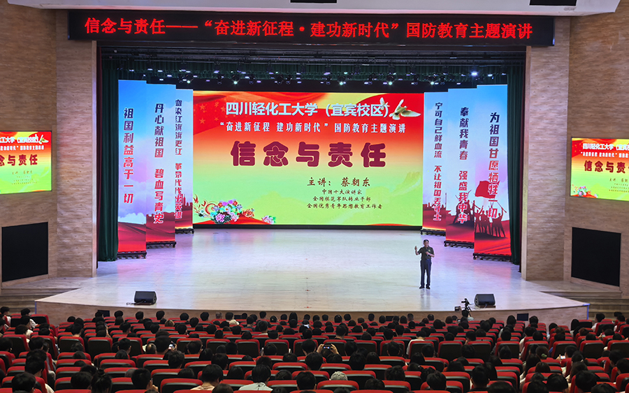 4月28日,正值老山胜利纪念日,全国优秀青年思想教育工作者、全国模范军队转业干部蔡朝东先生莅临我校宜宾校区作“信念与责任——奋进新征程·建功新时代”主题演讲。宜宾军分区政治委员闫川平大校、副司令员廖宣东大校,宜宾市军分区机关、市委宣传部、市委人才局、团市委、区人武部相关同志和宜宾大学城8所高校师生代表共千余人现场聆听。学校党委常委、宣传部部长万燚,党委学生工作部部长邹国正参加活动。
