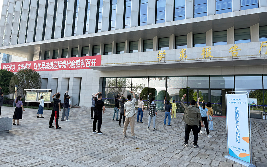 五月晨光中,《八段锦》古朴典雅的乐声回荡在李白河校区办公中心门前。学校机关工会广邀机关教职工在健身气功世界冠军、校团委副书记田怡然的带领下开展八段锦健身活动,以集体习练传统养生功法的方式开启工作日的活力清晨。该活动受到教职工们的热烈欢迎与积极响应。