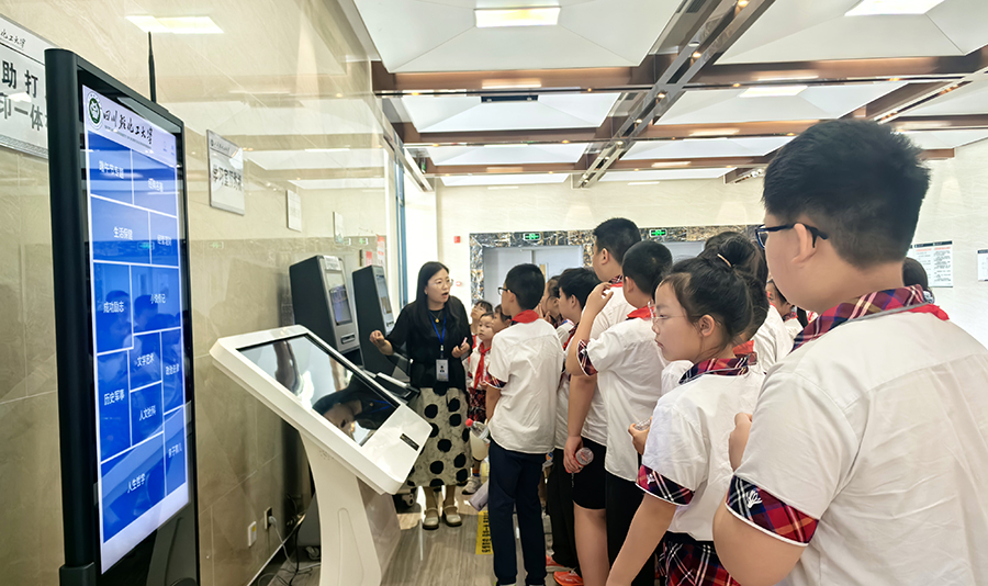 在科普课堂,赵俊博士以生动语言介绍人工智能发展及国际前沿成果,结合思政教育激发学生科学兴趣;实验室研究生通过点云建模设备、宇树四足机器人、人形机器人等场景,引导学生亲手操作体验机器学习、仿生学等技术,沉浸式感受科技魅力。屏山的师生们还参观了图书馆智能管理系统,在书海中体悟知识的力量。