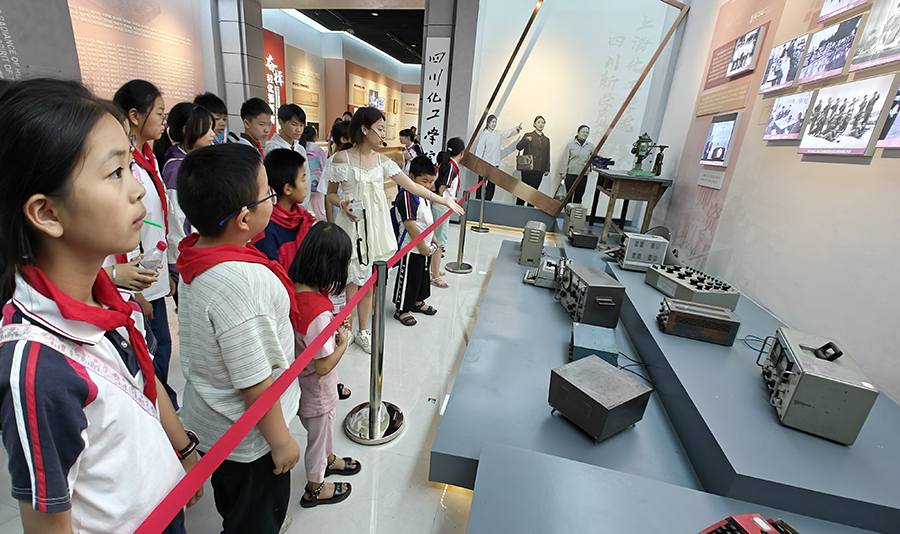 在学校志愿者的带领下,小朋友们依次走进学校尚艺馆、盐都大剧院、校史馆、图书馆和体育馆。在美轮美奂的尚艺馆内,恰逢美术学院2025届本科生毕业作品展,精美的自贡彩灯造型、逼真的雕塑作品以及创意十足的恐龙村文创工作坊,大家目不暇接,惊叹声不断;走进气势恢宏的盐都大剧院,现代化设施与精彩的舞蹈表演,让小朋友们叹为观止的同时更近距离感受到了艺术的独特魅力;在校史馆,大量翔实的档案照片和实物,生动呈现了川轻化近60年的发展历程,让孩子们对这所扎根盐都的本土大学有了新的全面认识和了解;走进图书馆,工作人员向小朋友们介绍先进的图书管理系统,大家对每本书里隐藏的“魔法芯片”充满了好奇;体育馆内,趣味互动游戏让小朋友们迅速和老师、志愿者们打成一片,欢声笑语在场馆上空持久回荡。