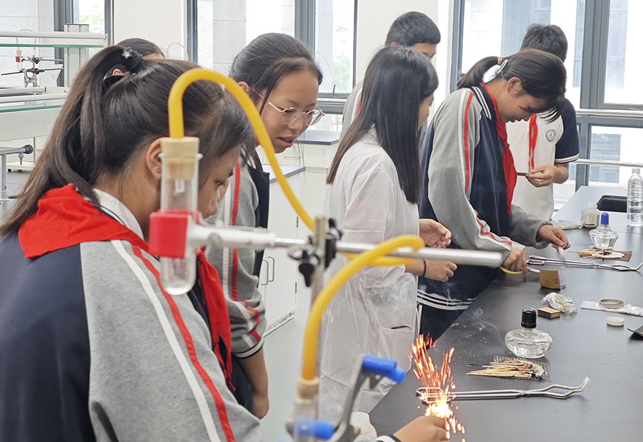 同学们分小组轮流到各个实验室,在老师的讲解和指导下,动手操作了老师们精心准备的安全性高、贴近生活、趣味性强和现象明显的实验项目,比如:大象牙膏、镁条烟花、烧不坏的手帕和心肺复苏模拟操作等。同学们认真观察实验现象,积极动手操作,表现出极大的兴趣和热情。随后,通过“秘密文件”显色的方式开盲盒抽取奖品,更是掀起现场高潮。
