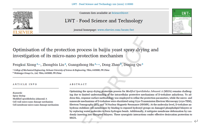 近日,我校节能环保装备创新团队在食品领域顶级期刊《LWT-FOOD SCIENCE AND TECHNOLOGY》(中科院1区TOP)上发表题目为“Optimisation of the protection process in baijiu yeast spray drying and investigation of its micro-nano protection mechanism”的学术论文。我校机械工程学院青年教师熊奉奎博士为论文第一作者,胡光忠教授和柳忠彬教授分别为通讯作者及第二作者,四川轻化工大学机械工程学院为论文第一署名单位。该论文研究工作得到了四川轻化工大学人才引经项目(2025RCZ066)、四川轻化工大学科研创新研究团队项目(SUSE652A010)等课题的资助。