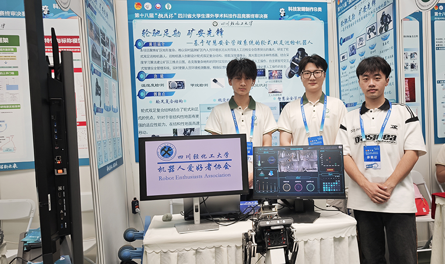在学校团委的组织下,机械工程学院高度重视、精心组织。其机器人爱好者协会代表队积极备赛。由黄波、柳忠彬、胡光忠三位教师指导,商智宇、冯炎莹、朱嘉豪等为核心成员的项目《轮驰足勘 矿安先锋——基于智慧安全管理系统的轮式双足巡检机器人》在2.2万件作品中脱颖而出,斩获一等奖,为学校和学院再添光彩,彰显了学院在拔尖创新人才培养和创新创业教育方面的成效。