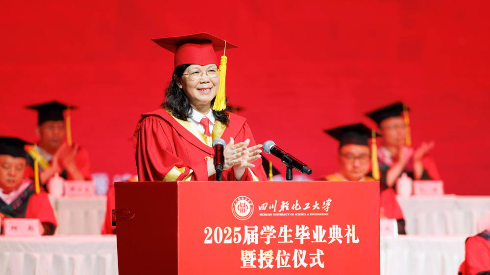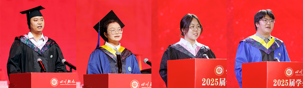 典礼上,毕业生代表展现了在川轻化成材蜕质、迭有进境的成长光谱。音乐学院本科毕业生、退役军人梁赐,以创业带动就业,携百项荣誉诠释“652”之精神;外语学院本科毕业生郑扬,以“雨过天青云破处”的东方美学翻译,架设起文明互鉴的虹桥;化工学院即将踏上博士征途的硕士毕业生刘晓聪,感念课题组在千万次失败中赋予的“破茧之力”;物电学院研究生毕业生苟睿,从专科起步,逆袭至四川大学博士,躬身践行“厚德达理,励志勤工”之校训。毕业生代表的发言,彰显了学校立德树人的丰硕成果。