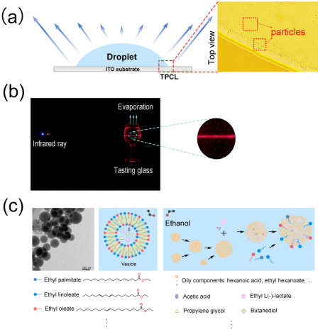 近日,我校食品与酿酒工程学院张智副教授和袁思棋副教授作为共同通讯作者,在应用物理领域TOP期刊《Droplet》(JCR一区TOP,IF=9.1)上发表题为“Ethanol evaporation drives ester assembly and particle deposition in droplets of Chinese distilled liquors”的学术论文。张智副教授、研究生付浩然和钟羊为共同第一作者。该论文由食品与酿酒工程学院食品安全与健康团队和酿酒生物技术及应用团队的酒类风味与酒体设计课题组合作完成,第一通讯单位为四川轻化工大学。此外,西北工业大学臧渡洋教授、三明学院刘永明博士作为共同通讯合作完成本研究。