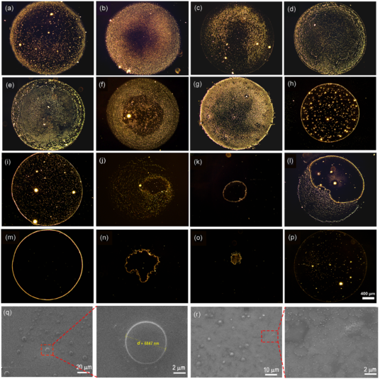 图2 不同蒸馏酒的液滴蒸发沉积图案. a-l, 经典的12种香型中国白酒;m-p, 白兰地、伏特加、朗姆和威士忌蒸馏酒. q-r, SEM观察颗粒形态