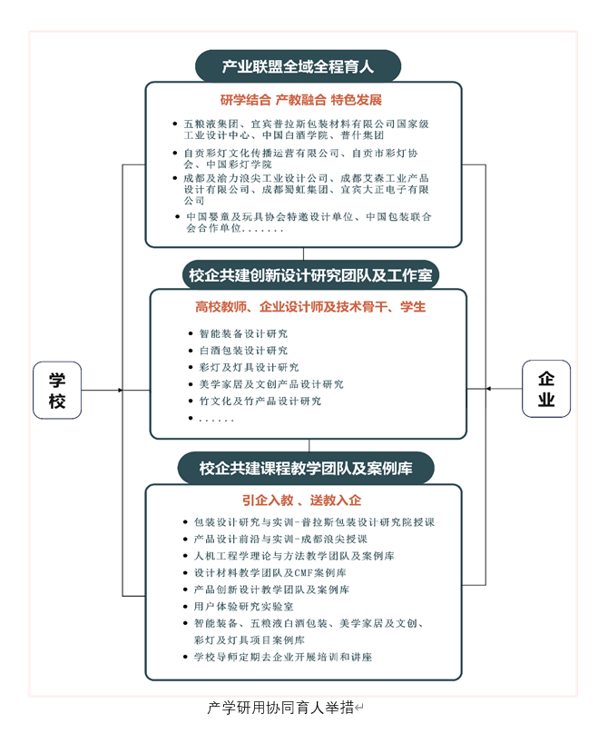 基于学生对企业真实项目有天然热情的深刻认知,张玲玉成功构建起产教融合生态圈:一方面,通过校企融通机制,与五粮液集团、自贡彩灯公司、浪尖设计等地方龙头企业共建省级工业设计中心及校级研究中心,联合组建产品创新设计研究团队和校企教学团队,并打造出聚焦智能装备、白酒包装、文创家居、彩灯灯具四大领域的主题工作室;另一方面,推行理实赛创一体培养模式,以企业真实项目实训和学科竞赛双轮驱动,通过建立专业实践基地,打造菁英设计集训营、智慧无界大师讲堂、彩灯产业论坛等特色平台,形成企业采纳应用优秀成果,未采纳方案转化为获奖竞赛作品的高效闭环,持续激发学生的创新激情与能力进阶。