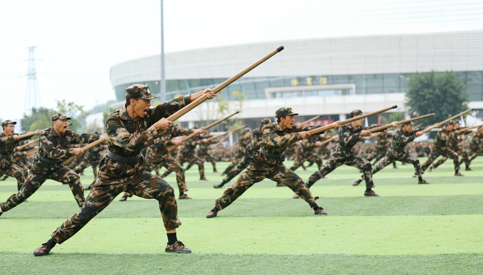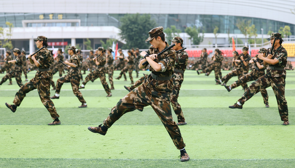 在随后进行的军事训练科目汇报表演中,各表演方阵依次登场,展现出新时代学子昂扬的精神风貌。匕首操方阵闪转腾挪,刀光熠熠;应急棍方阵虎虎生风,势如破竹;军体拳表演刚劲有力,气势如虹;刺杀科目喊声震天,尽显血性胆气;警棍术科目动作精准,制敌有方;擒敌方阵配合默契,招招制胜。各表演方阵动作规范、气势磅礴,充分展现了军训的丰硕成果。