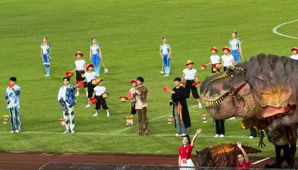 除了严谨细致的志愿服务,在两市比赛场上由学生们带来的暖场表演同样成为赛事亮点,节目创意紧密围绕地方文化特色展开。由我校美术学院组织的40人模特队伍,在《自贡啊,自贡》的欢快乐曲中绽放青春力量,模特队队长郑歆璐表示,“当站上宽阔的球场,面对观众们热情的呐喊,紧张与兴奋交织,音乐响起瞬间,所有人都全情投入。”法学院的张宇吉同学参演了节目《金江回响》,他动情地回忆排练过程:“尽管烈日当空,大家依旧顶着太阳在足球场上认真练习每一个动作,熟悉每一个鼓点。这种付出在演出时刻得到了回报,我们尽全力用热情点燃赛场,退场后只剩满满的成就感。”材料学院的吴筱翎和周煦傑同学也纷纷表示,这次高规格平台的历练,极大地提升了他们的艺术表现力和自信心。