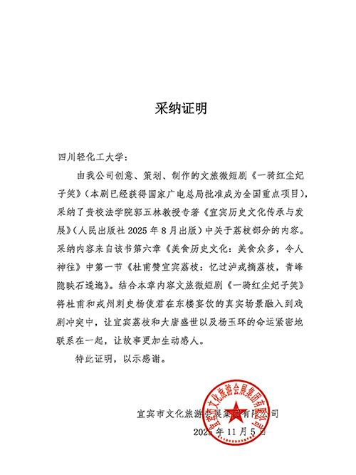 近日,我校收到宜宾市文化旅游会展集团有限公司发出的采纳证明。该公司制作的微短剧,已获国家广电总局批准被列为全国重点项目的《一骑红尘妃子笑》,采纳了我校法学院郭五林教授专著《宜宾历史文化传承与发展》(人民出版社2025年8月出版)中关于荔枝的相关内容。