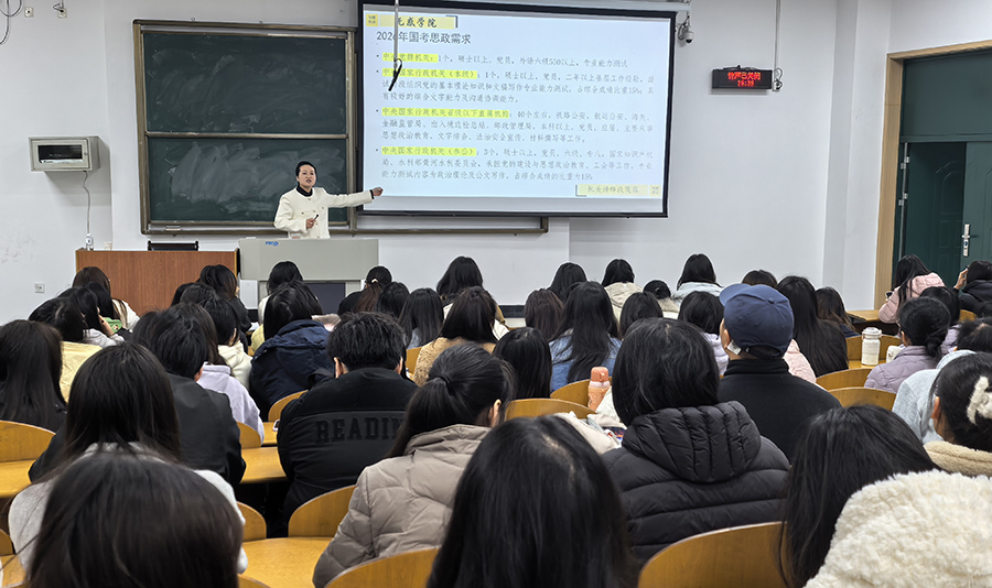 讲座针对思政专业学生,重点梳理了对口公务员岗位所需的政治素养与理论能力,并就笔试复习、面试流程、答题逻辑等关键环节提供具体建议,助力学生精准对接岗位需求。