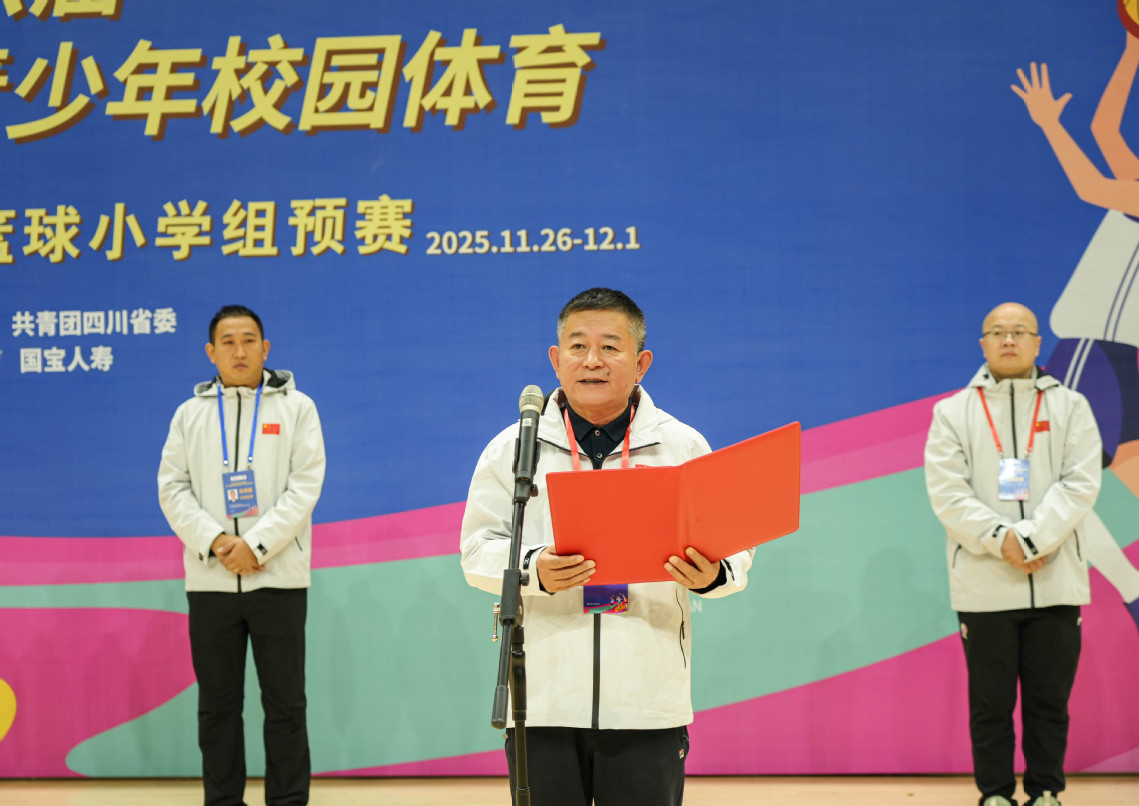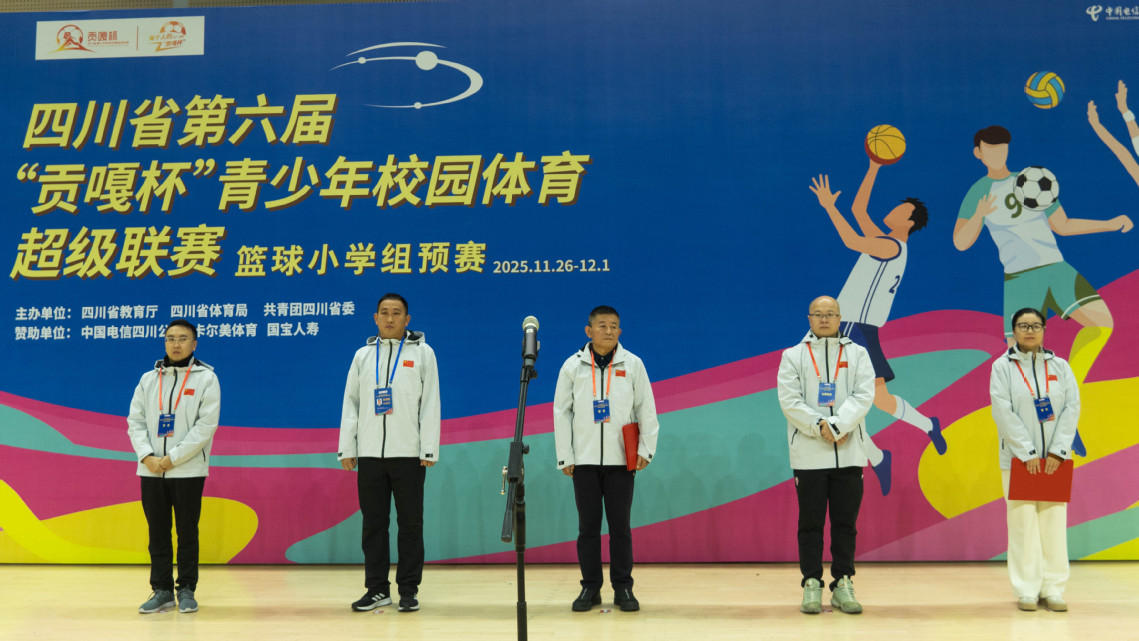 四川省教育厅体卫艺处一级调研员赵维山,四川省篮球协会竞赛部副部长蓝业华,我校体育学院党委书记王红旗,自贡市大安区人民政府副区长周怡,自贡市教育和体育局青少年体育科科长李小军,纪律监督张成鑫,技术代表刘宇平及各参赛单位领队、教练和运动员出席开赛仪式。