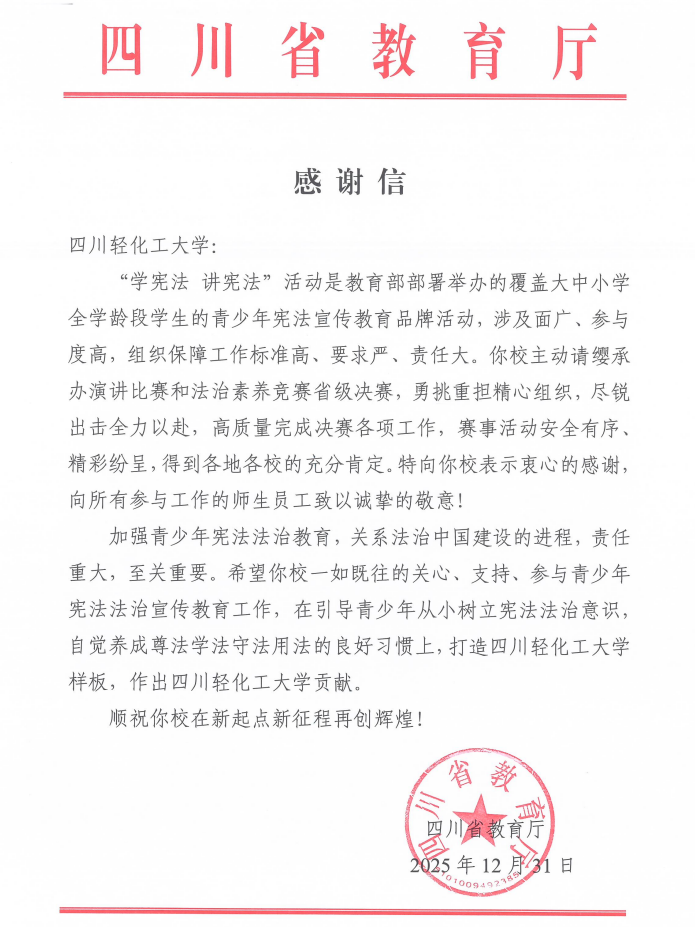 近日,我校收到四川省教育厅感谢信,对学校成功承办第十届全国学生“学宪法 讲宪法”演讲比赛和法治素养竞赛四川赛区总决赛予以高度肯定。感谢信指出,我校在赛事组织中主动担当、精心筹划,取得卓越成效,并向所有参与工作的师生员工致以诚挚敬意。