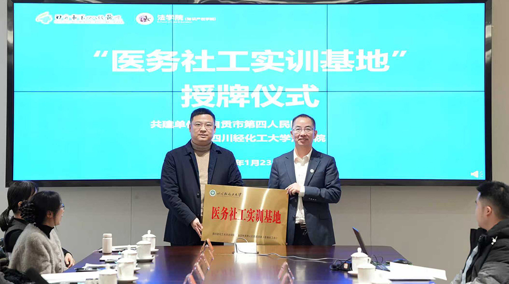 仪式上,双方代表签署共建协议,并为“四川轻化工大学法学院实训基地”“自贡市第四人民医院医务社工培训实践基地”揭牌。医院还向法学院教师颁发了医务社工督导聘书。