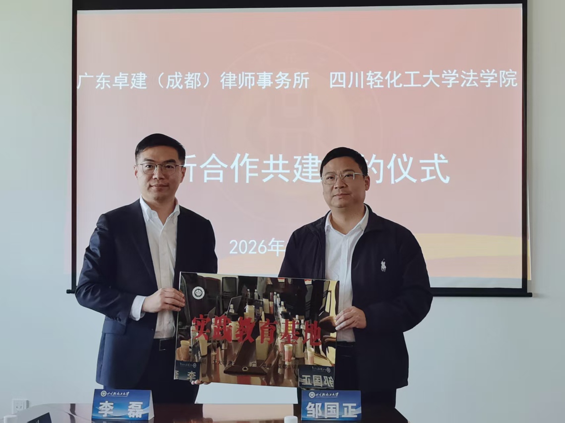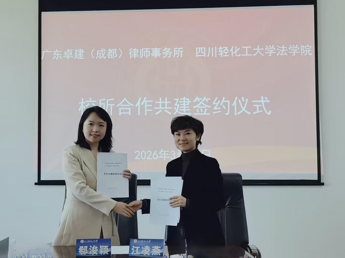 3月26日下午,我校法学院与广东卓建(成都)律师事务所在宜宾校区举行合作共建签约暨授牌仪式。卓建成都律所主任李磊、执行主任郗浚颖一行,法学院党委书记邹国正、副院长江凌燕等出席仪式。