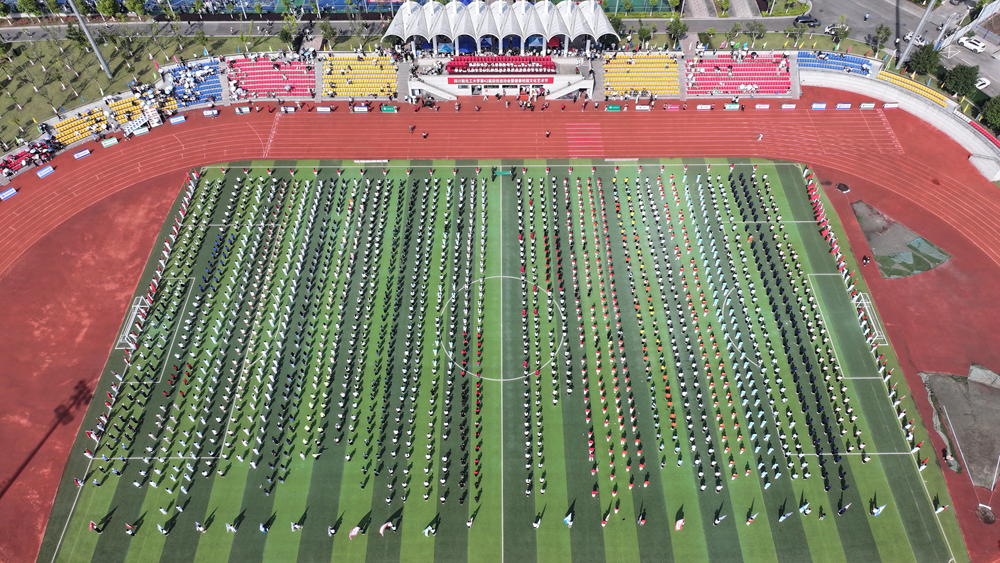 广播操展演结束后,全场师生齐声高唱《歌唱祖国》。嘹亮的歌声在田径场上空回荡,歌声中饱含着对祖国的深情祝福,也唱出了新时代青年“强国有我”的铮铮誓言。
