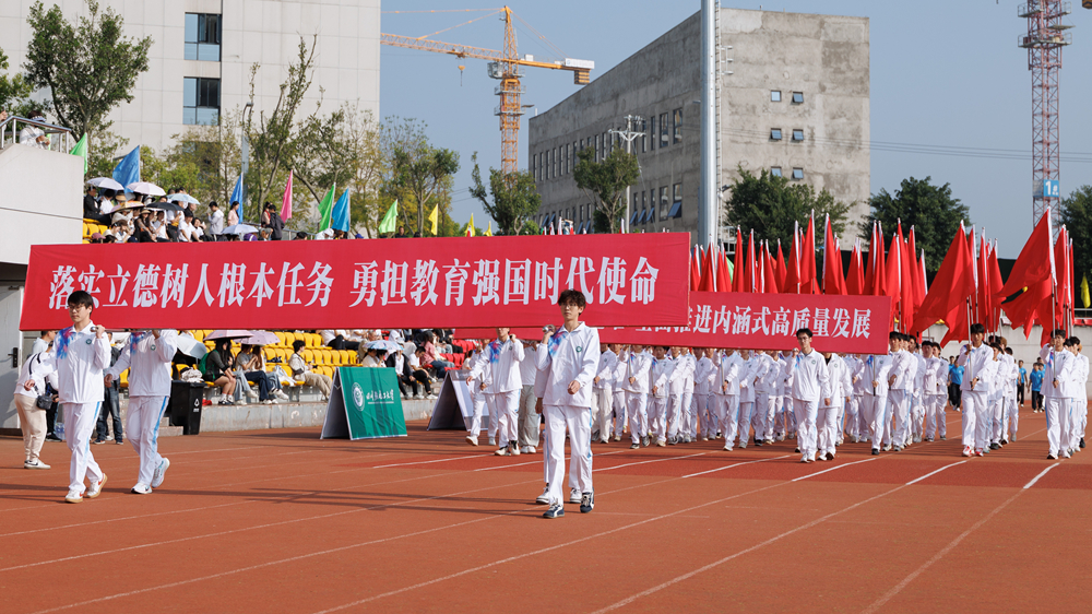 升旗仪式后,学校党委副书记陈范华,党委常委、副校长罗惠波分别在李白河校区和宜宾校区致开幕辞,代表学校向运动会的开幕表示热烈祝贺,向辛勤筹备的工作人员表示衷心感谢。致辞中指出:体育强则国家强,国运兴则体育兴。过去一年,学校在竞技体育与群众体育领域成绩斐然——学校多个代表队在国家级、省级赛事中斩获奖项百余项,啦啦操全国锦标赛揽金3项,省大学生田径比赛获23项荣誉;承办“贡嘎杯”、全国大学生网球锦标赛总决赛等高水平赛事;在近期火爆的“川超”赛事中,贡献优秀球员,组织200余名学生志愿者和学生演员全程参与。学校坚持体教融合,在一、二年级全面推行“一学期90公里健身跑”与游泳课全覆盖,让全民健身、终身锻炼蔚然成风。