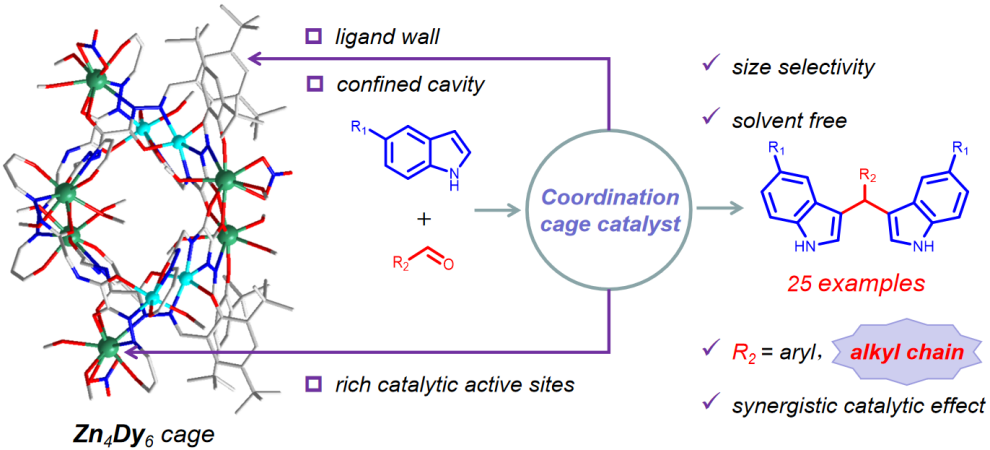 复杂异核配位纳米笼的制备及其协同催化性能的研究一直以来是配位化学领域的热点方向之一。该论文报道了含有N﹑O结合位点的非对称多齿酰腙配体(H5L)的设计合成,此配体丰富的配位口袋将过渡金属Zn(II)﹑稀土金属Dy(III)组装成一例3d-4f十核配位笼Zn4Dy6。配体壁的拓扑结构使得Zn4Dy6笼具有开放的椭球形窗口和限域内部空腔,丰富的Lewis酸性活性位点占据笼的内部及表面。重点研究了此配位笼在催化合成双吲哚甲烷衍生物(BIMs)方面的活性(BIMs在抗肿瘤、抗艾滋病毒、抗菌和抗炎方面具有显著的药理活性)。研究发现Zn4Dy6笼可以作为醛类和带有给电子基团的取代吲哚的Friedel-Crafts烷基化反应的有效协同催化剂。同时,Zn4Dy6异多核配位笼在多种不同类型的醛中展现出显著的限域尺寸选择性,并且该配位笼在配合物催化领域中首次实现了脂肪醛与吲哚类化合物的催化转化。结合实验佐证,该工作提出了具有可行性的限域协同催化机制,为后续异核配位笼的设计、制备及催化应用研究提供了重要理论参考与技术支撑。
